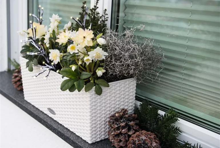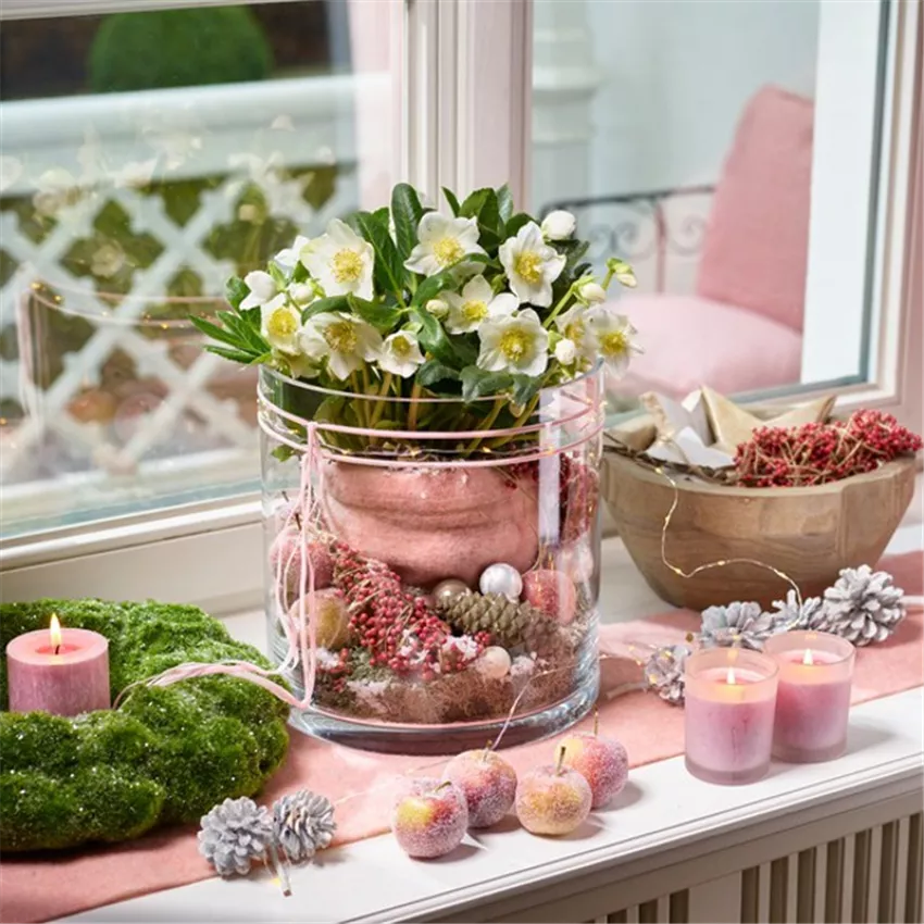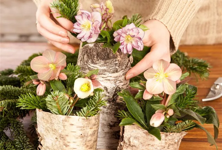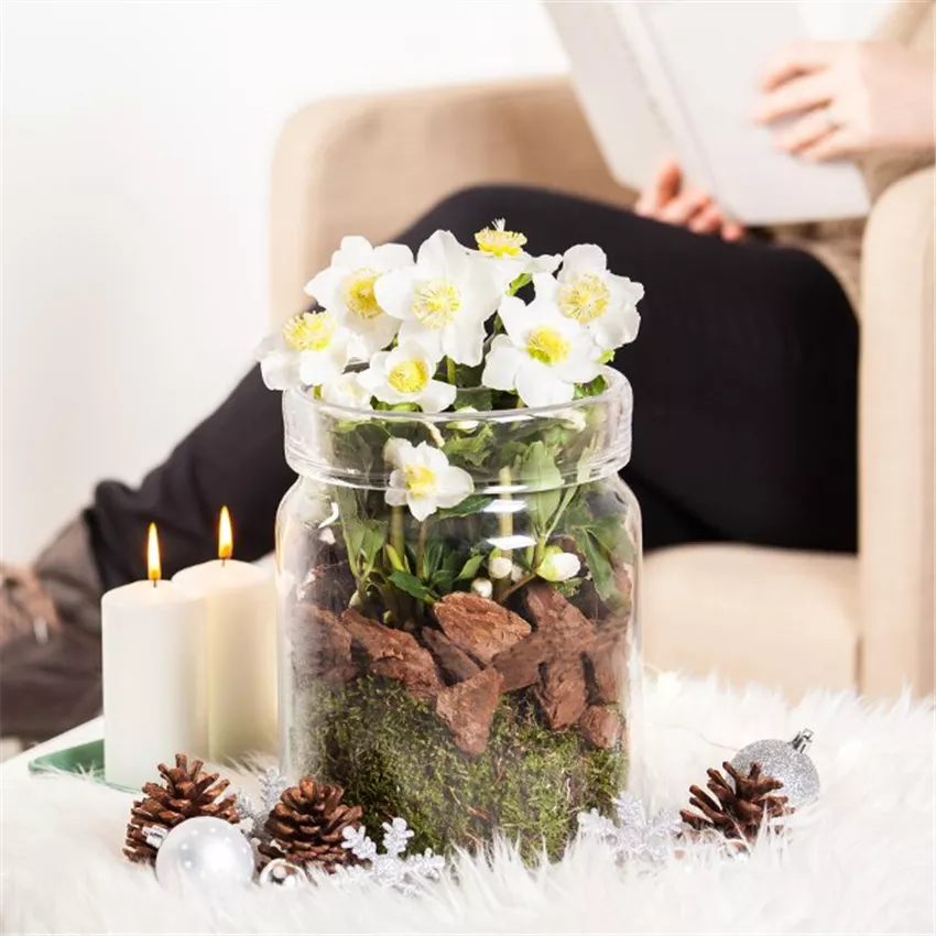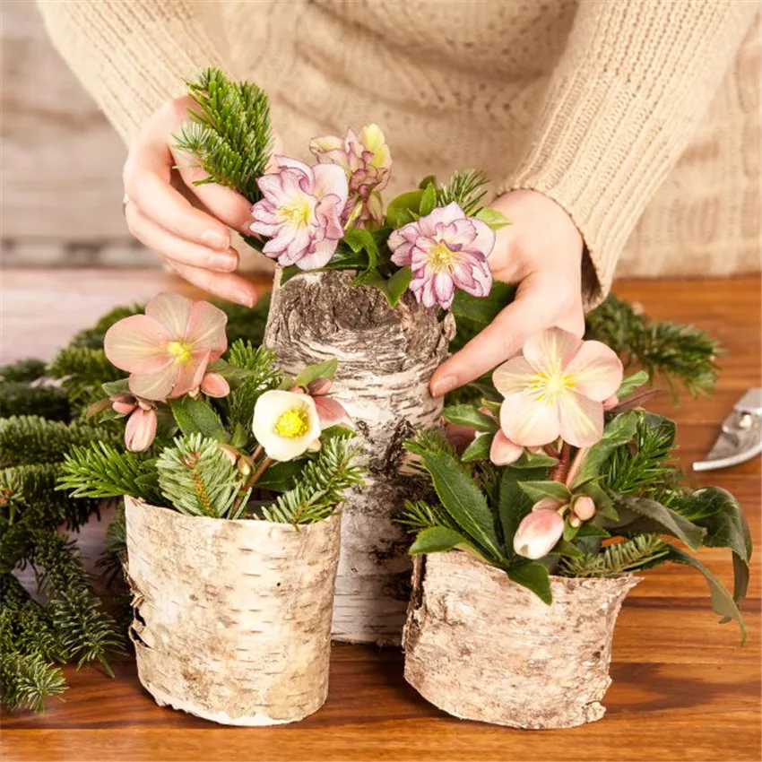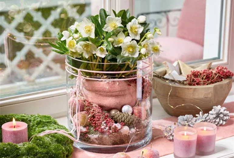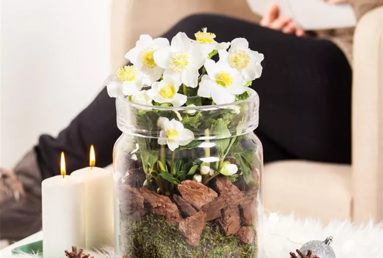 Im Haus wirken sie mindestens genauso elegant wie im Freien. Besonders gut entwickeln sich die Pflanzen in einem möglichst hohen Topf in dem die Wurzeln viel Platz haben. Die Auswahl der Pflanzgefäße ist herrlich vielfältig: Christrosen fühlen sich Glasgefäßen oder auch modernen silberfarbenen Übertöpfen wohl und werden in jeder Einrichtung zum Star. Dekoriert werden sie zum Beispiel mit angesagtem Naturmaterial wie Eukalyptus, Moos, Tanne, Rinde, Zapfen oder rosa Pfeffer. Lichterketten oder Kerzen runden das Stillleben perfekt ab und lassen die Christrosen und ihre Begleiter in einem festlichen Glanz erstrahlen.