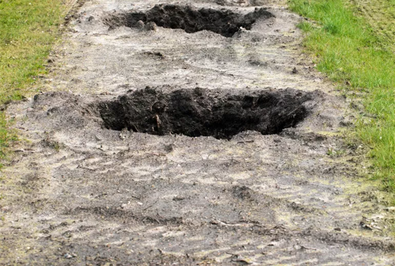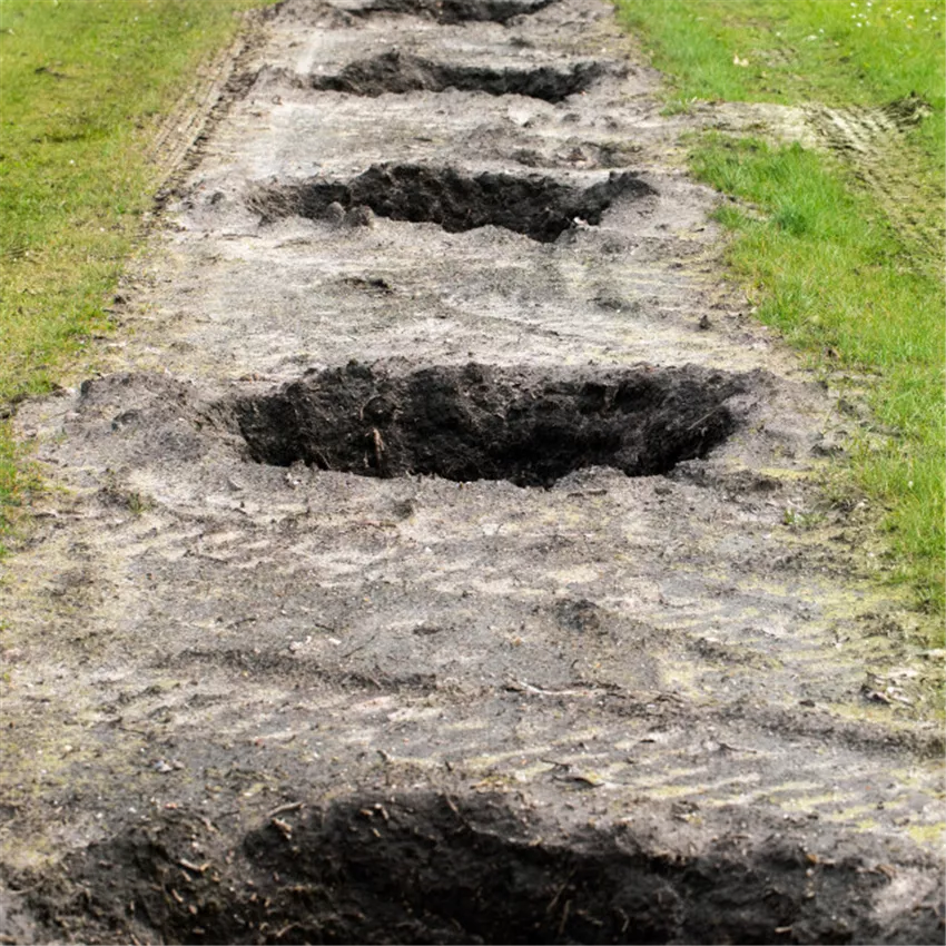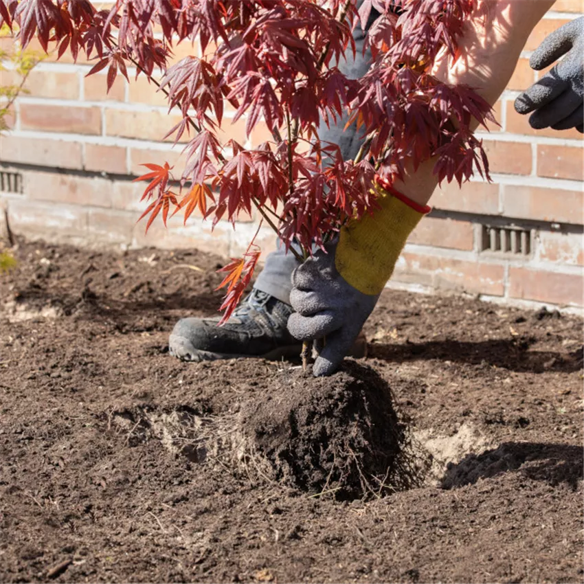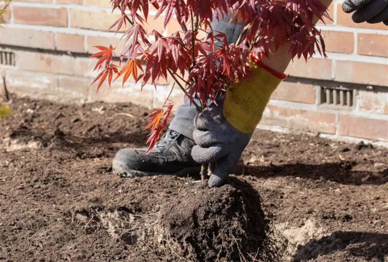 Damit die Gehölze gut anwachsen, benötigen sie gute Startbedingungen: Zunächst wird mit einem Gärtnerspaten das Pflanzloch ausgehoben, das etwa eineinhalb bis zweimal so breit und tief sein sollte wie das Wurzelwerk der Pflanze. Es lohnt sich, auch den Boden rund um das Pflanzloch von Unkraut und Steinen zu befreien und großzügig mit einer Harke aufzulockern. Denn ein stark verdichteter Boden erschwert das Einwurzeln, es kann sogar zu Staunässe (oder Trockenheit bei Wassermangel) kommen, was der Pflanze ebenfalls Probleme beim Anwachsen bereiten kann. Außerdem können sich die Wurzeln so ungehindert ausbreiten und gut anwachsen und es ist eine gute Wasserdurchlässigkeit gegeben. Eine Drainage aus Kies oder etwas Erde vermischt mit Sand verbessert die Wasserdurchlässigkeit noch. Bei größeren Gehölzen oder Bäumen kommen ein oder mehrere stützende Pflanzpfähle am besten gleich mit in das Pflanzloch. Danach wird mäßig angegossen und der Boden nicht zu fest angedrückt um den Boden nicht direkt wieder zu verdichten. Auch ein Gießrand ist ratsam.