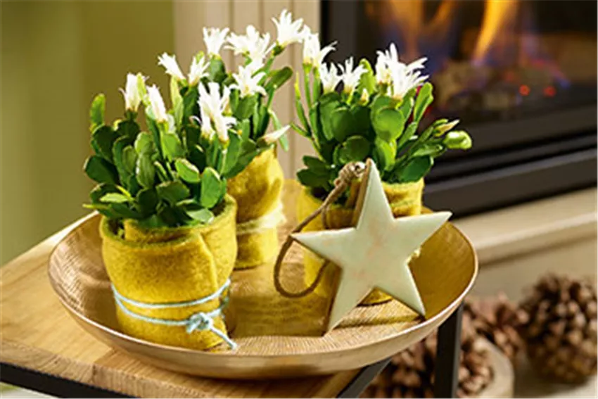 Minipflanzen, zum Beispiel weißblühende Weihnachtskakteen, werden mit breitem Wollband in Gelb umwickelt und somit schön warm eingepackt. Fixiert wird das Ganze mit etwas grüner Wolle.