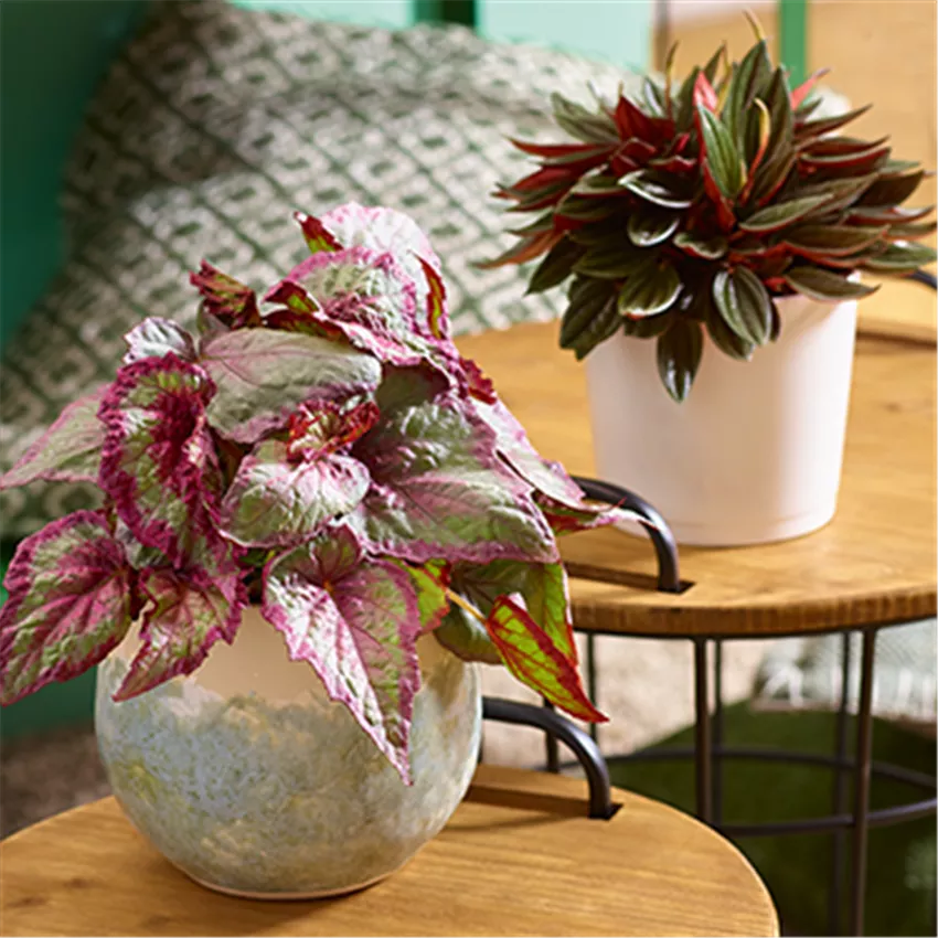 Blattbegonien wirken besonders hübsch, wenn sie in kleinen Gruppen arrangiert werden. Mit unterschiedlichen Übertöpfen und z. B. auf kleinen Holztischchen platziert, ziehen sie im Wohnzimmer alle Blicke auf sich.