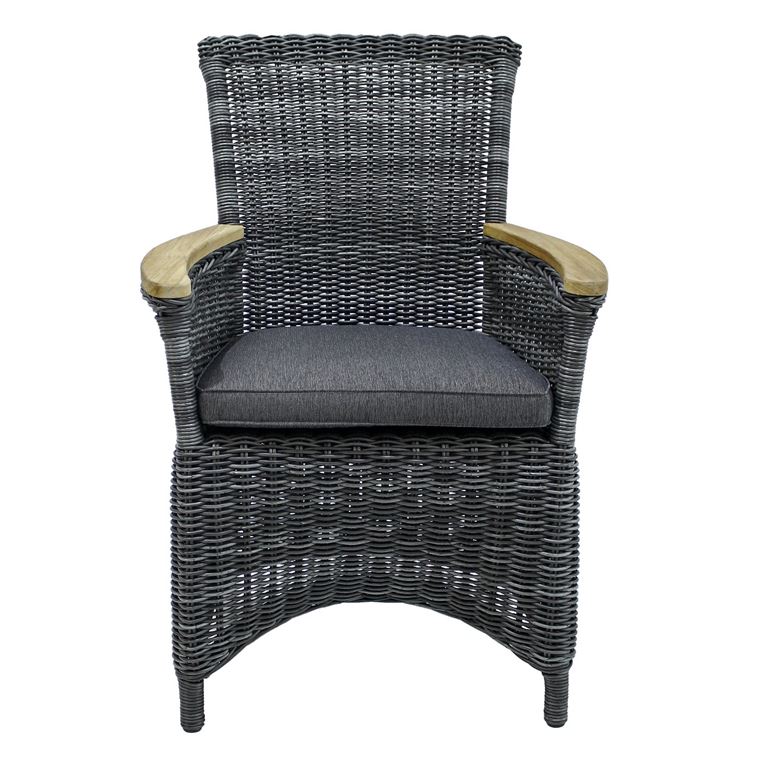 Der AKS Ohio Diningsessel besteht aus handgeflochtenem Polyrattan.Die Armlehnen aus Teakholz sind Temperaturneutral und haben eine angenehme Haptik beim Auflegen der Arme, bei Teakholz gehören Graufärbung und auch Rissbildung im Holz zu den natürlichen Eigenschaften.Des Weiteren besteht der Unterbau aus rostfreiem Aluminium und ist somit ideal für den Außenbereich geeignet. Die Sitzkissen sind enthalten und können bei Bedarf auch gewaschen werden. Außerdem ist das Polyrattan witterungsbeständig und pflegeleicht, zusätzlich können Sie Ihre Möbel mit der passenden atmungsaktiven Schutzhülle von Aerocover vor Witterungseinflüssen und Verschmutzungen schützen. Die Korbmöbel geben Ihrer Terrasse eine wohnliche und gemütliche Atmosphäre. Der Stuhl hat folgende Maße: L 72 x B 65 x H 94cm